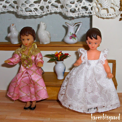 Ari dukkefamilie i My Home dukkehus køkken iført håndsyet nyt tøj.